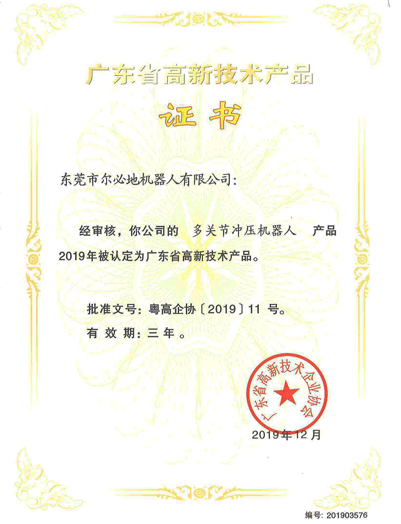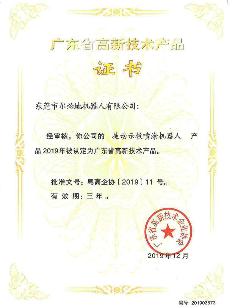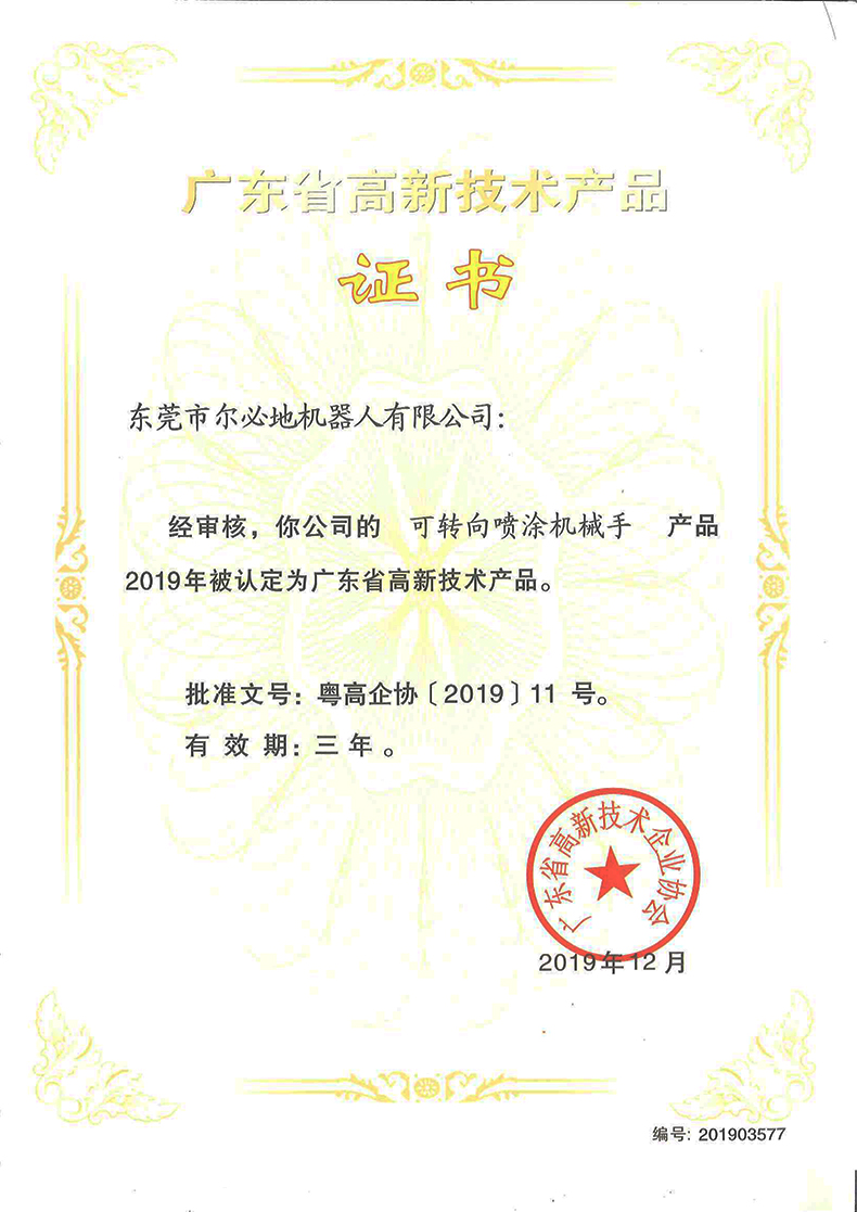 東莞市爾必地機(jī)器人有限公司在全體員工的共同努力下,經(jīng)過嚴(yán)格的層層審查,最終喜獲由廣東省高新技術(shù)企業(yè)協(xié)會(huì)頒發(fā)的《廣東省高新技術(shù)產(chǎn)品證書》,此次獲得高新技術(shù)產(chǎn)品認(rèn)定的產(chǎn)品有六個(gè),分別是“可轉(zhuǎn)向噴涂機(jī)械手”、“多關(guān)節(jié)防爆噴涂機(jī)器人”、“拖動(dòng)示教噴涂機(jī)器人”、“多關(guān)節(jié)碼垛機(jī)器人”、“多關(guān)節(jié)沖壓機(jī)器人”、“六軸噴涂機(jī)械手”。