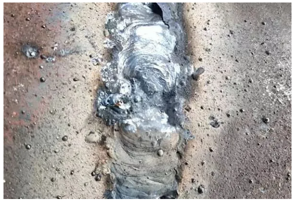 (5)選擇電流過(guò)大,受潮的焊條內(nèi)部含有大量的水份,在髙溫熔解下,一部分水份被熔解在熔液中,在焊接電弧高溫作用下,便熔解在金屬的熔液氣體發(fā)生劇熱膨脹而脹裂,造成小粒熔液金屬小滴落到焊縫及其兩側(cè)母材上。當(dāng)溫度不高時(shí),小粒熔液金屬冷卻成一般性飛濺,當(dāng)溫度較高時(shí),熔合在焊縫及其兩側(cè)母材表面的受熱區(qū)域,稱為熔合性飛濺。